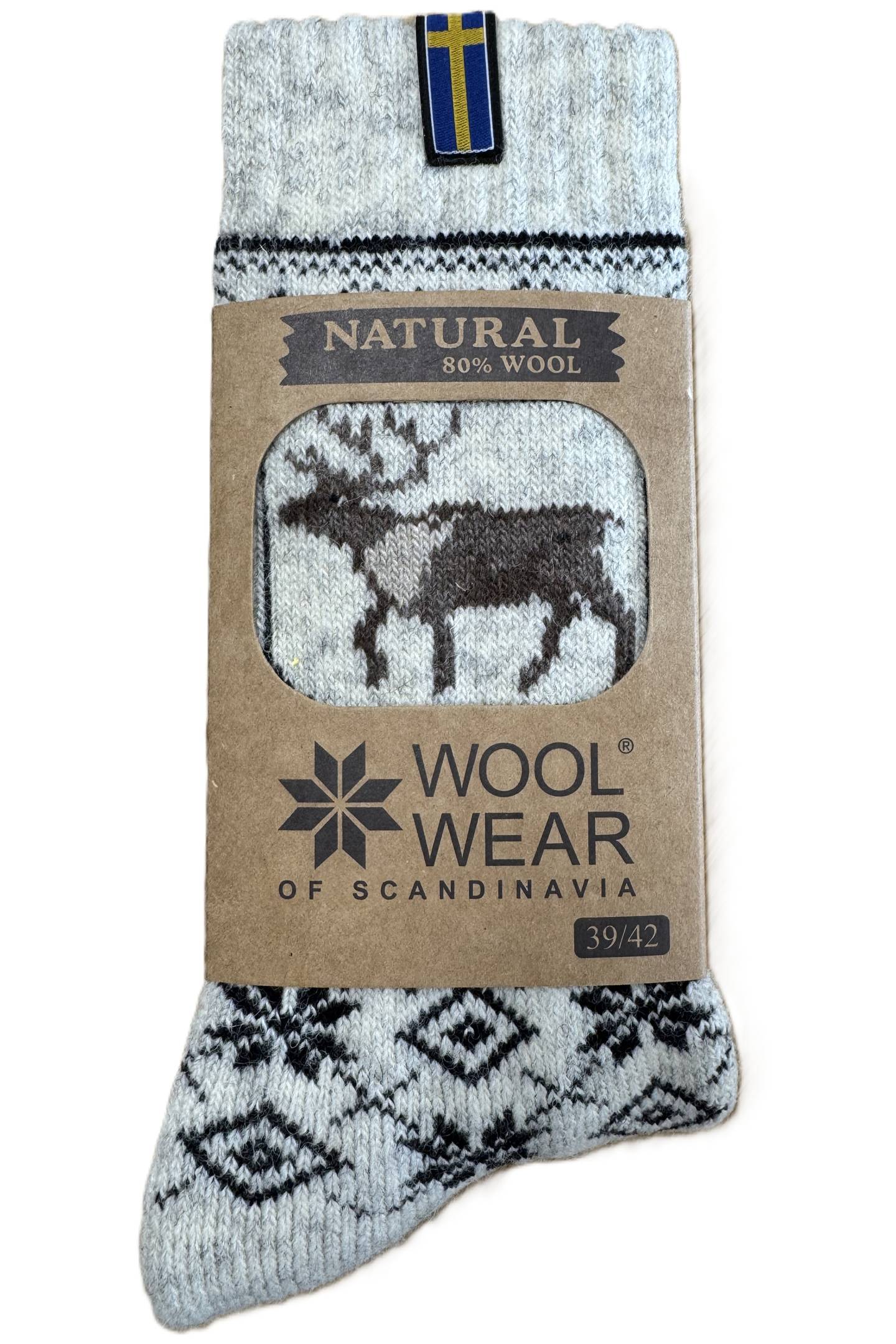 WOOLWEAR ullstrumpor med vackert renmotiv, av extremt mjuk och läcker kvalitet av 80% lammull. Ullstrumporna har en liten finvävd svensk flagga.